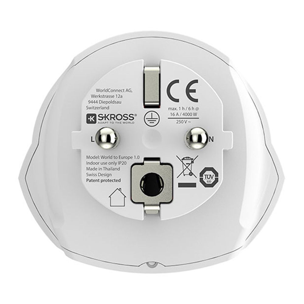 Adaptador Mundial A Europa Skross 1500211-E. Diseñado En Suiza. Ideal Para Equipos Con Enchufes Con Y Sin Conexión A Tierra (2 Y 3 Polos). Entrada: Suiza, Italia, Brasil, Reino Unido, Estados Unidos/Japón,Australia/China, Europa. Salida: Europa (2P+T Tipo F). Voltaje De Entrada: 100V/250V. Máx. Carga: 16A. Clasificación De Potencia: P. 100V/1600W, 250V/4000W. No Convierte Voltaje.