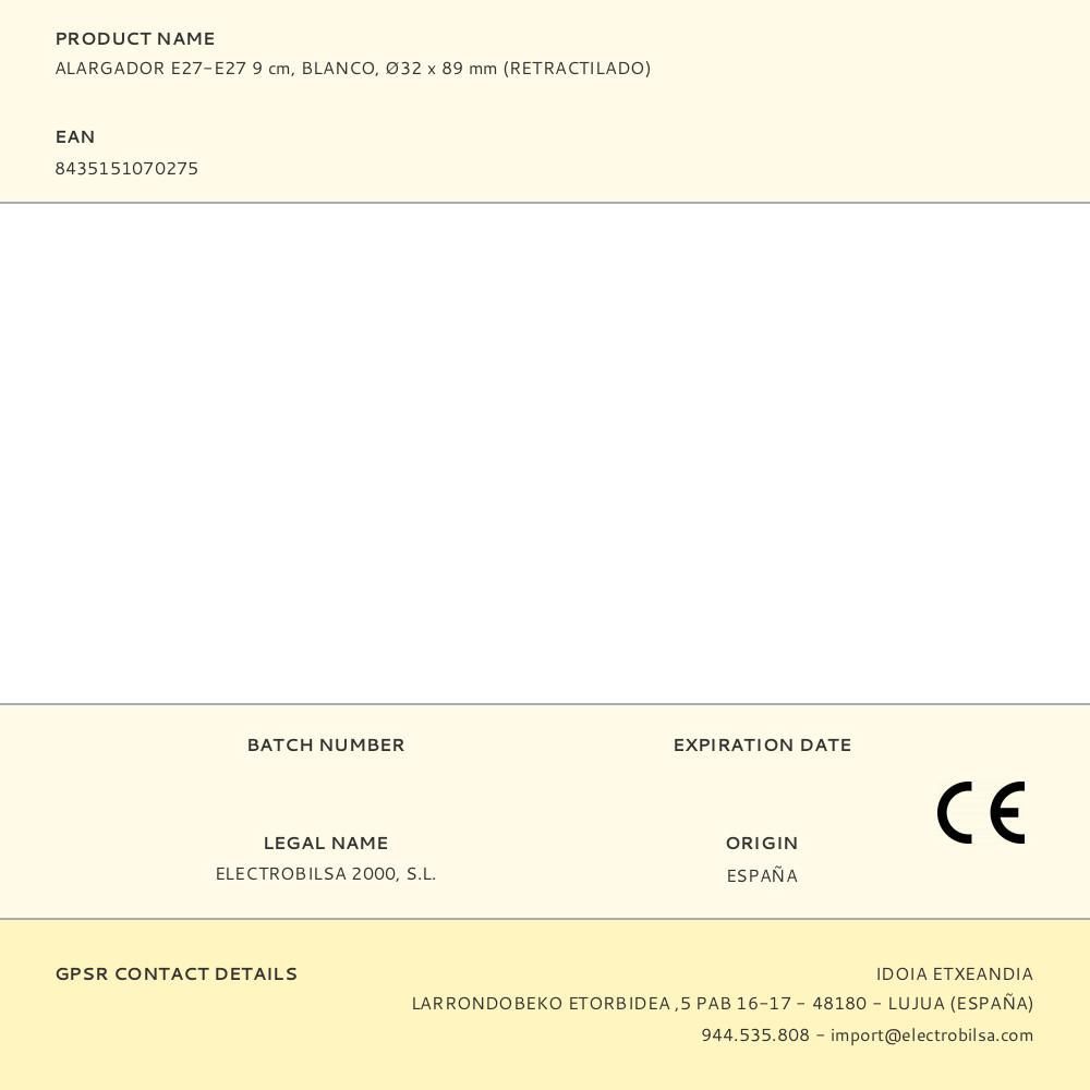 Alargador E27-E27 9 Cm, Blanco, Ø32 X 89 Mm (Retractilado)