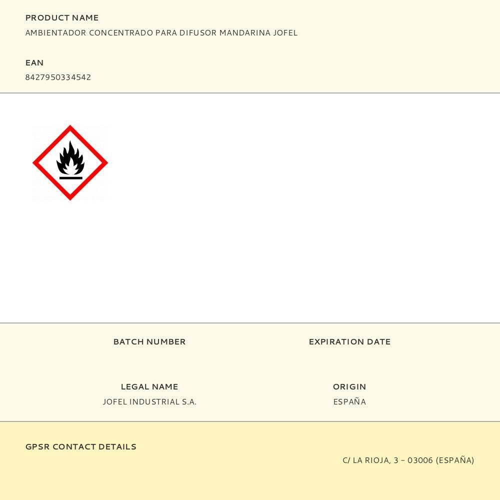 Ambientador Concentrado Para Difusor Mandarina Jofel. Ambientador Aerosol Concentrado, Perfume Mandarina, Ambientador Con Alta Concetración De Perfume: 6%. Envase Metálico Con Válvula De Seguridad Que Impide Dispensación Larga Y Continuada, Envasado Con Perfume Natural Y Gas Inocuo E Inofensivo Para La Capa De Ozono, Uso Exclusivo Con Difusor De Origen, Tapón Protector Para Evitar Descargas No Deseadas, Incorpora, Adicionalmente, Dentro Del Tapón Protector Un Difusor Universal Para Uso General, Descarga De 0,065/0,075G. Por Pulsación/Dosis, Efecto Ambientador Inmediato Y Persistente, Especialmente Indicado Para Oficinas, Baños Y Establecimientos Públicos, Uso Generalizado Y Universal. Capacidad 250Ml.
