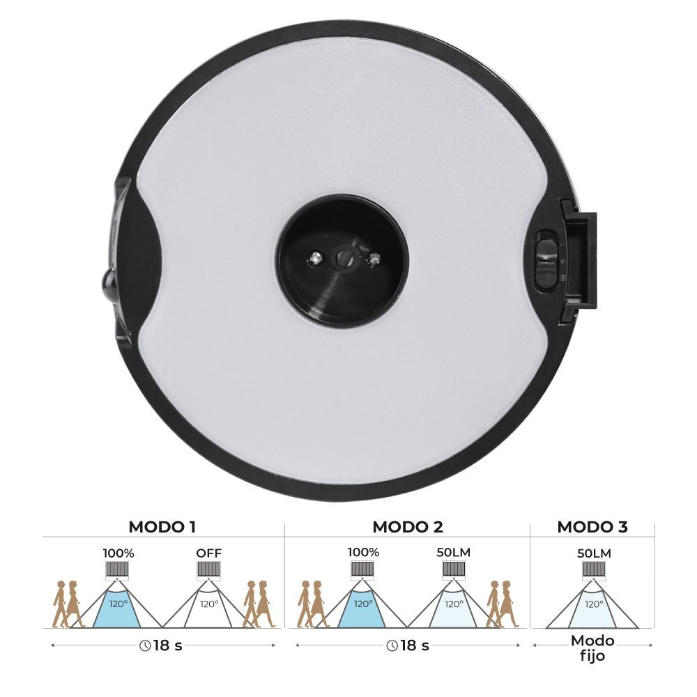 Aplique - Estaca Solar 4W 500 Lm. Incluye Batería 3.7V 2.000Mah. Potencía Del Panel: 2,5W. 3 Colores De Luz Para Elegir: 3.000K Cálida, 4.000 Día, 6.500K Fría. Ip54. Con Sensor De Presencia Y Varias Opciones De Detección, Tiempo De Carga 6-8H, Tiempo Funcionamiento 8-10H, 47 Leds, Area Iluminada 10-20M², Vida Util 15.000H Aprox, Material Abs+Pc, Dimensiones: Ø16X4Cm. Edm