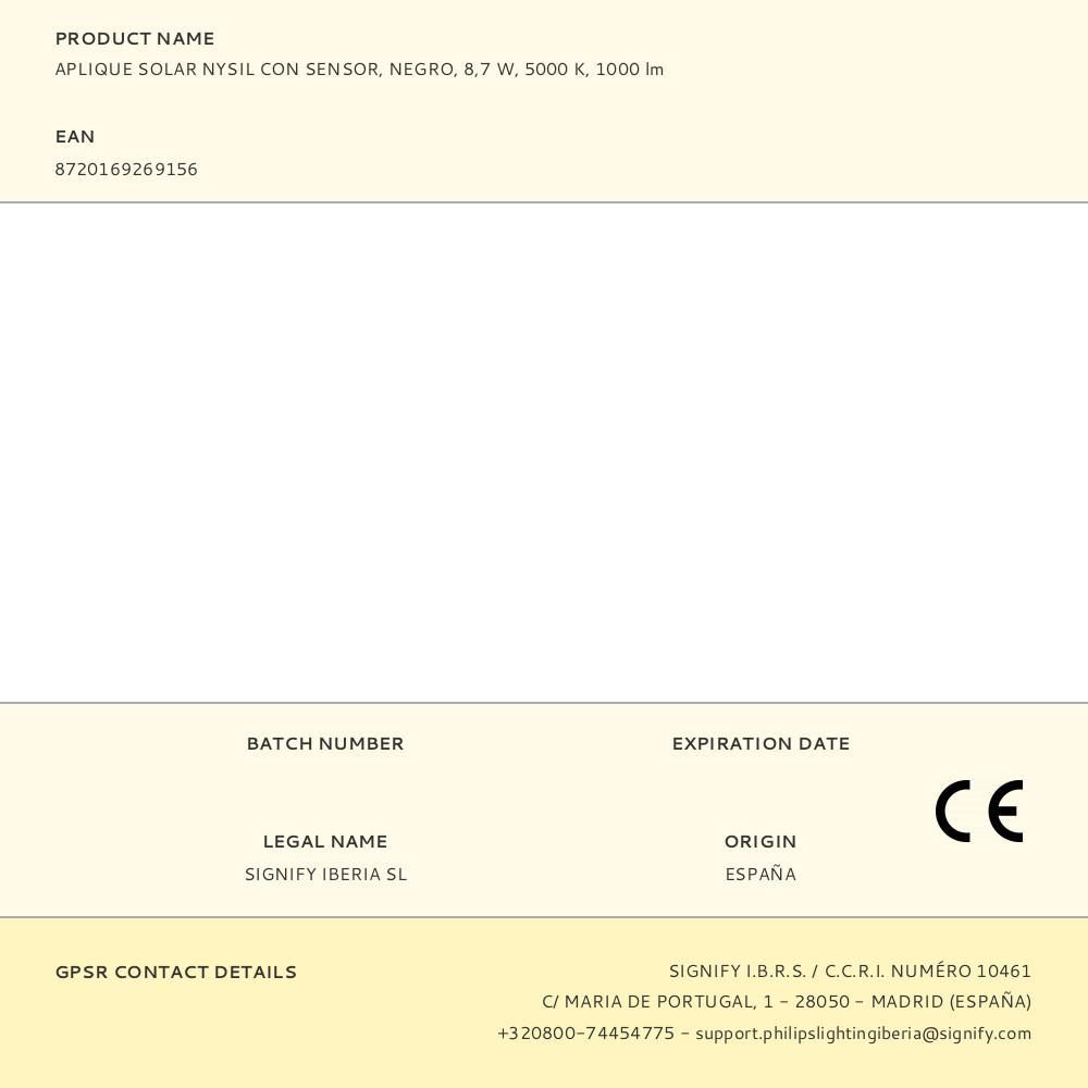 Aplique Solar Nysil Con Sensor, Negro, 8,7 W, 5000 K, 1000 Lm