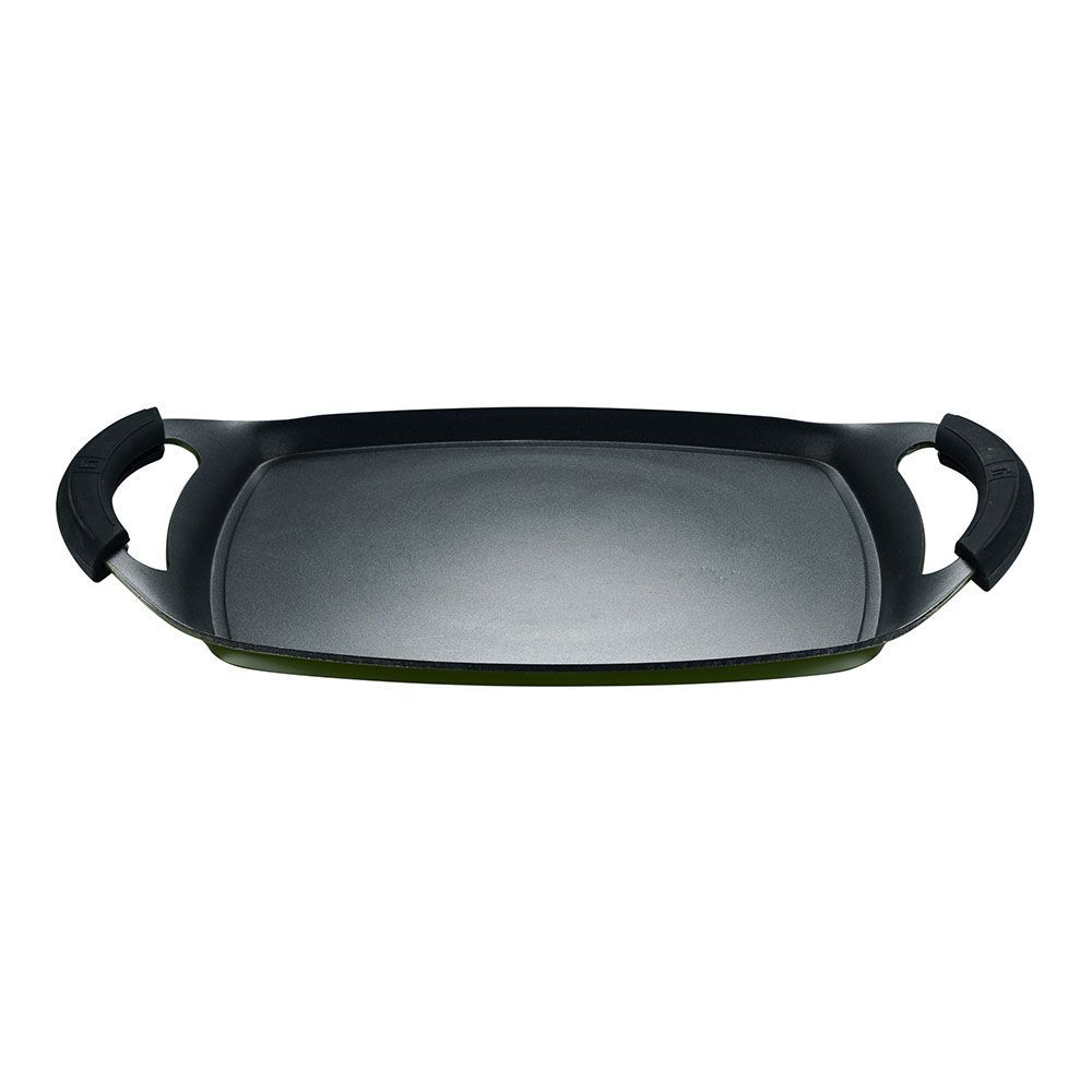 Asador De Aluminio Forjado Para Inducción, Acabado Exterior Verde, Interior Con Revestimiento Antiadherente Negro, Exterior Resistente Al Calor En Pq-7764C. Asas De Silicona. 37 X 25 Cm
