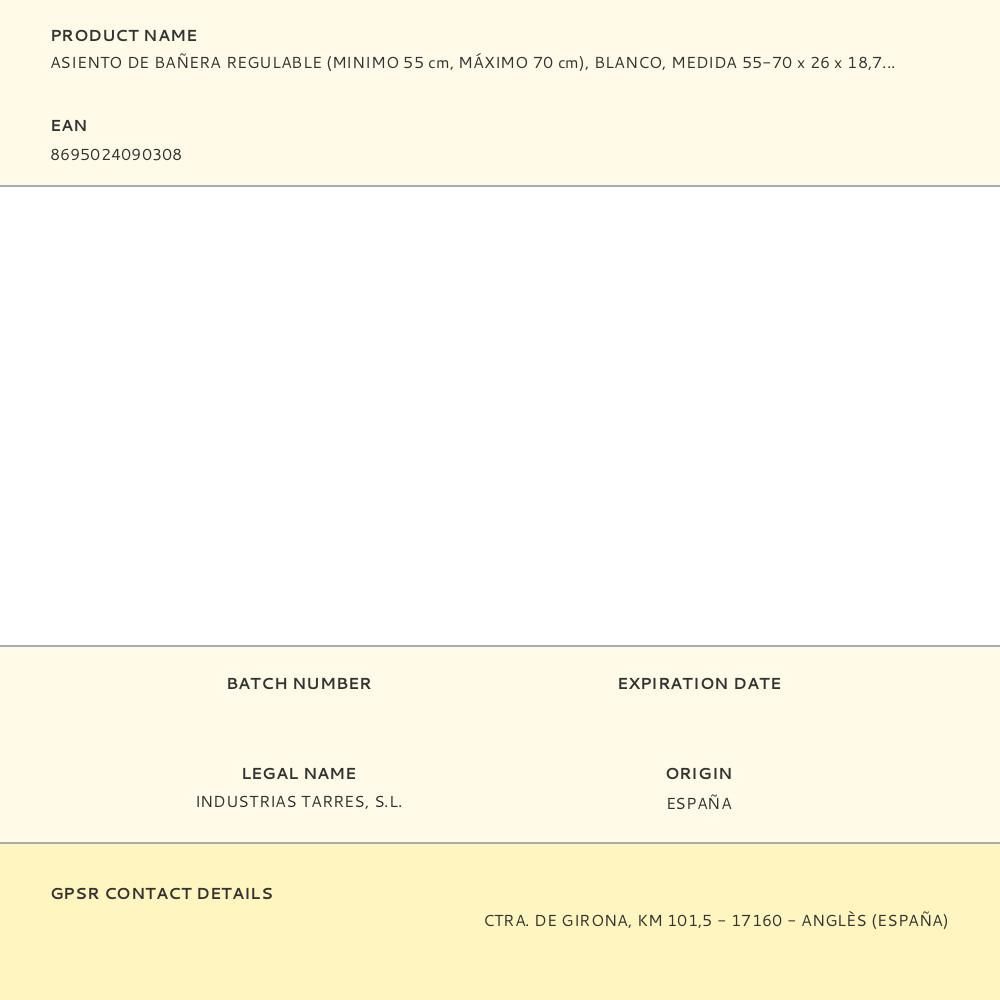 Asiento De Bañera Regulable (Minimo 55 Cm, Máximo 70 Cm), Blanco, Medida 55-70 X 26 X 18,7 Cm