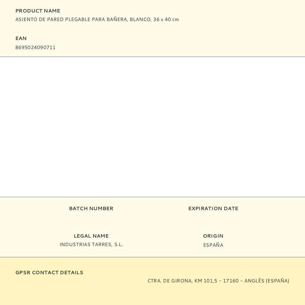 Asiento De Pared Plegable Para Bañera, Blanco, 36 X 40 Cm