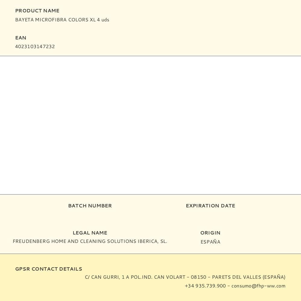 Bayeta Microfibra Colors Xl 4 Uds. Bayeta De Microfibras Multiusos De 4 Colores Diferentes. Buena Capacidad De Limpieza Y Absorcion. Cuatro Colores Diferentes. Medidas 36 X 38 Cm