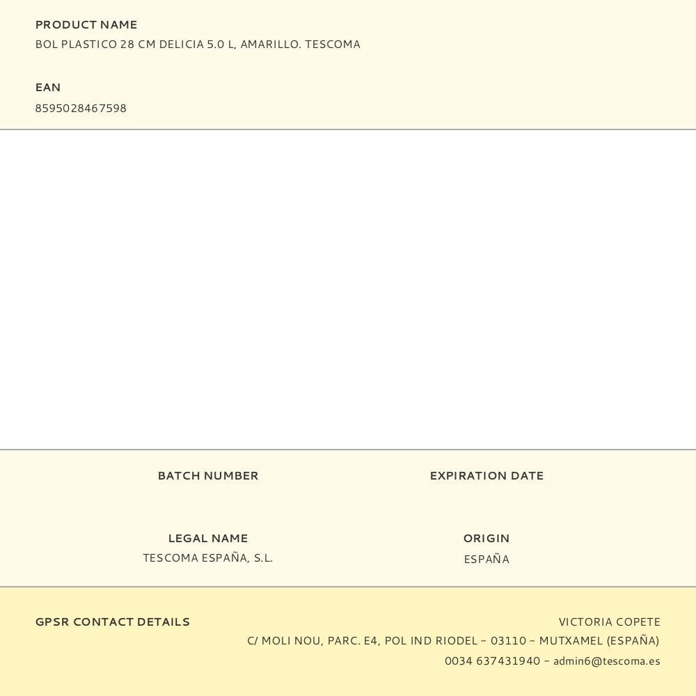 Bol Plastico 28 Cm Delicia 5. 0 L, Amarillo. Fabricado De Excelente Plástico Resistente. Adecuado Para Microondas, Apto Para Lavavajillas Y Frigorífico/Nevera. Garantía De 3 Años