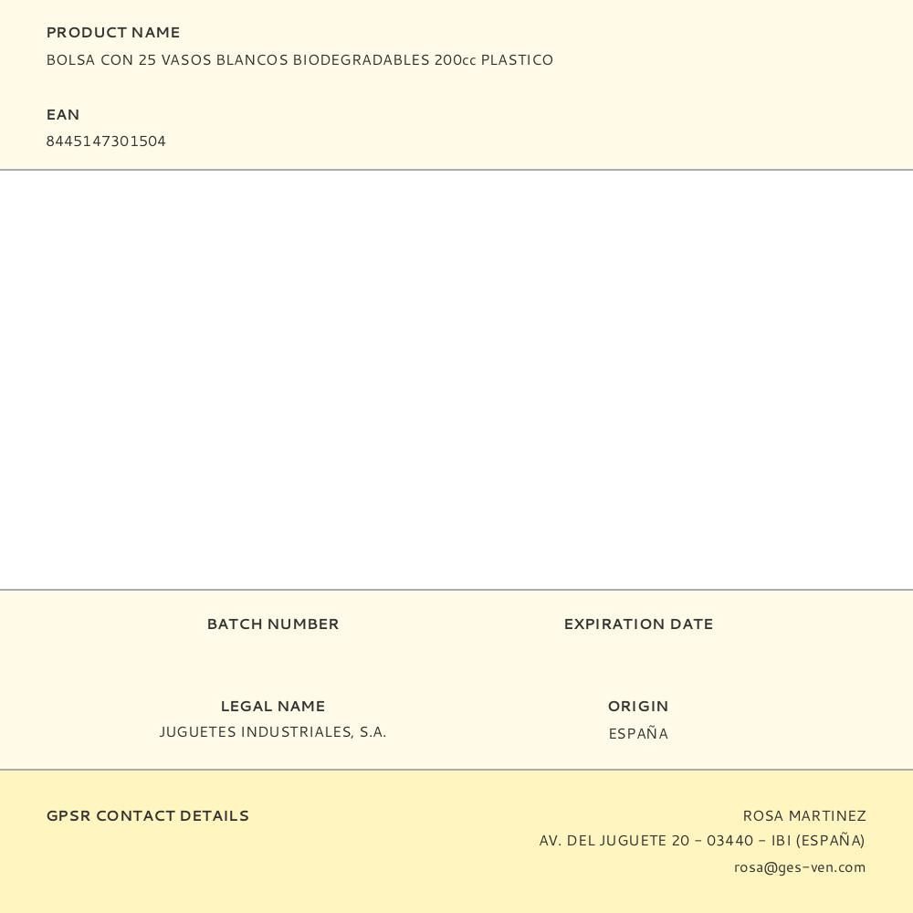 Color , Blanco , Capacidad , 200 cl , Tipo , Vaso de pl u00e1stico , Material , Pl u00e1stico biodegradable , Características , Aguanta temperatura hasta 50 u00b0 , Características , u00daso no apto para microondas