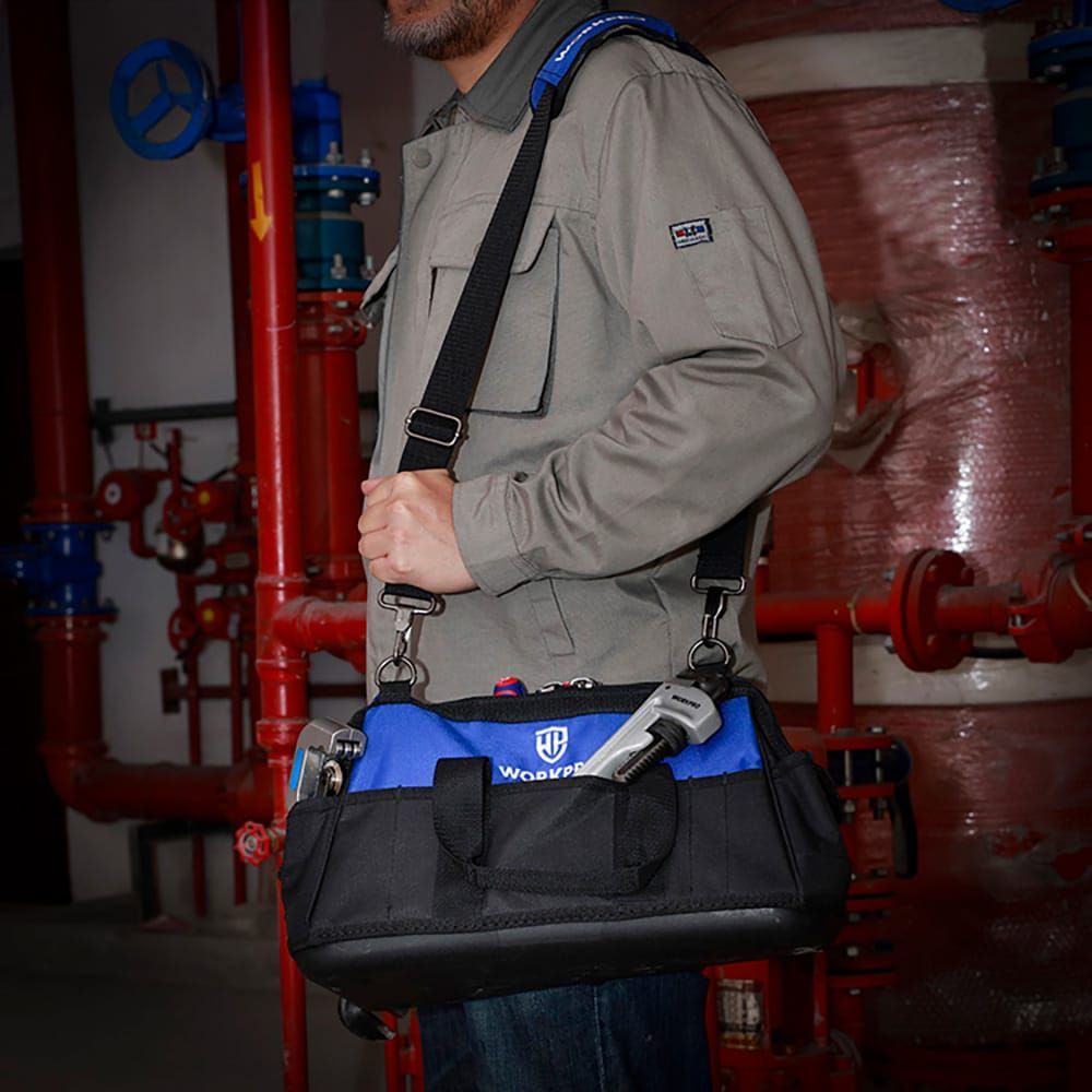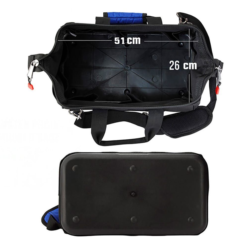 Bolsa De Herramientas Con Cremallera En La Parte Superior, 51 X 26 X 29 Cm. 21 Bolsillos. Base A Prueba De Agua. Bolsa De Almacenamiento De Boca Ancha Que Permite Un Fácil Acceso Al Contenido. Correa Ajustable, Bolsillos Exteriores Para Guardar Objetos Personales, Herramientas Pequeñas Y Accesorios. Negra Y Azul