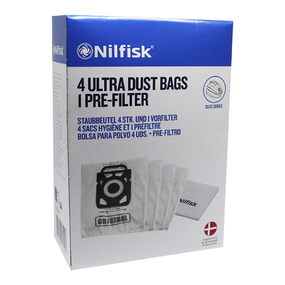 Bolsas De Aspirador Original Sintetica Blanca Con Enganche De Plastico Negro, Para Nilfisk Elite Series, Extreme Series, Gm200/300/400/500 Sintetica Con Enganche De Plastico Negro , Envasadas En Caja De Carton 4 Bolsas + 1 Filtro