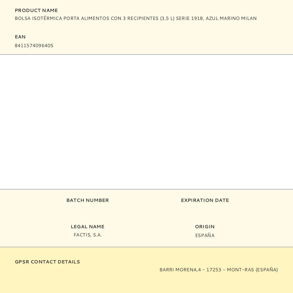 Bolsa Isotérmica Porta Alimentos Serie 1918 Azul Marino Con 3 Recipientes 3,5 L. Contiene 3 Recipientes: Un Recipiente Cuadrado Blanco, Un Recipiente Rectangular Con Tapa Azul Marino Y Un Recipiente Redondo Azul Marino Hermético (Con Tapa Roscada). Interior Aislante Térmico (Frío/Calor) Para Una Mejor Conservación De Los Alimentos. Apertura Total Para Una Mejor Accesibilidad Y Limpieza. Práctico Bolsillo Interior Con Cremallera. Correa Regulable Y Extraíble. Tejido Exterior 'Ripstop': Ligero Y Resistente A La Rotura Y Rasgaduras. Utiliza Una Técnica Especial Que Teje Hilos Gruesos De Refuerzo A Intervalos Regulares En Un Patrón Entrecruzado. Composición Tejido: Exterior De Poliéster Y Forro Interior Isotérmico (P.E.V.A.). Medidas:23 X 20 X 11 Cm. Capacidad: 3,5 Litros