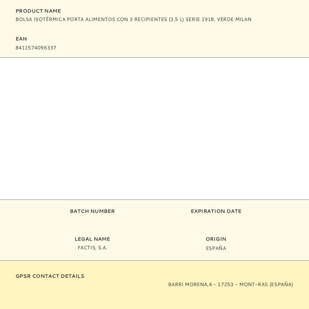 Bolsa Isotérmica Porta Alimentos Serie 1918 Verde Con 3 Recipientes 3,5 L. Contiene 3 Recipientes: Un Recipiente Cuadrado Blanco, Un Recipiente Rectangular Con Tapa Verde Y Un Recipiente Redondo Verde Hermético (Con Tapa Roscada). Interior Aislante Térmico (Frío/Calor) Para Una Mejor Conservación De Los Alimentos. Apertura Total Para Una Mejor Accesibilidad Y Limpieza. Práctico Bolsillo Interior Con Cremallera. Correa Regulable Y Extraíble. Tejido Exterior 'Ripstop': Ligero Y Resistente A La Rotura Y Rasgaduras. Utiliza Una Técnica Especial Que Teje Hilos Gruesos De Refuerzo A Intervalos Regulares En Un Patrón Entrecruzado. Composición Tejido: Exterior De Poliéster Y Forro Interior Isotérmico (P.E.V.A.). Medidas:23 X 20 X 11 Cm. Capacidad: 3,5 Litros
