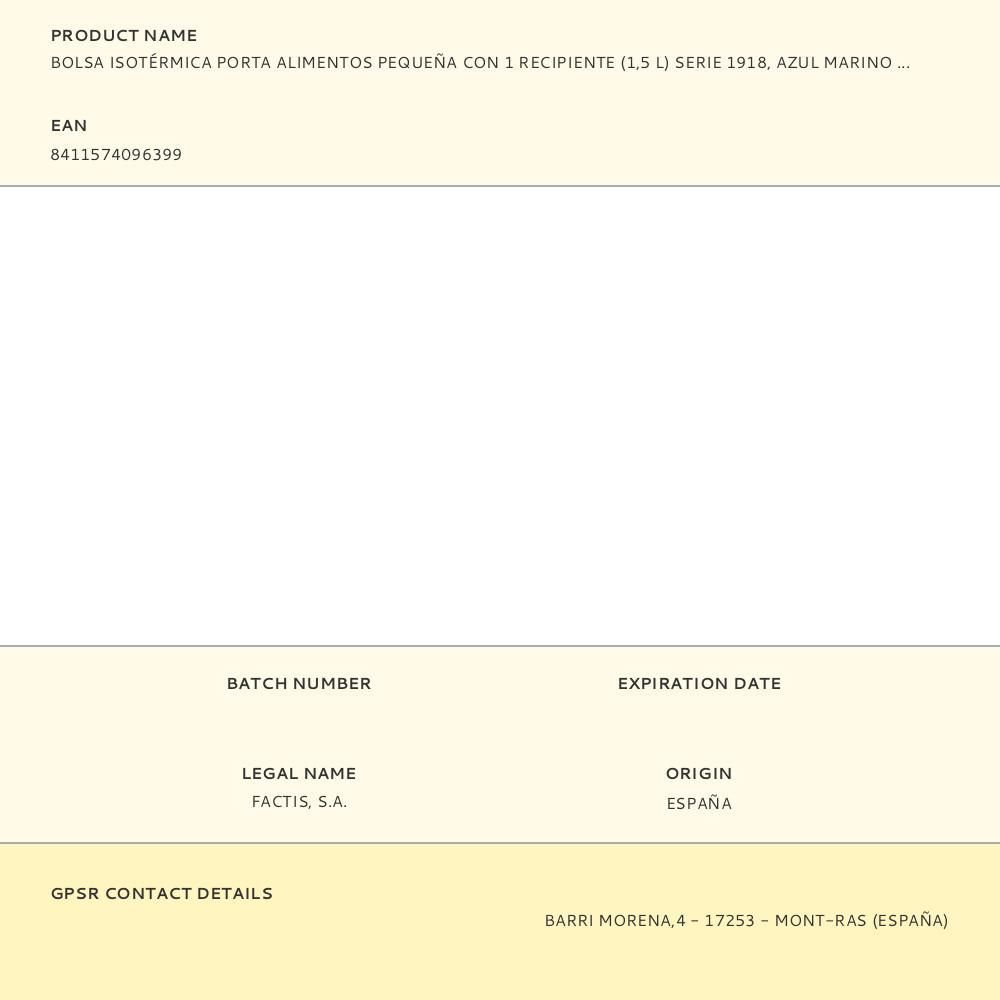 Bolsa Isotérmica Porta Alimentos Serie 1918 Azul Marino Con 1 Recipiente 1,5 L. Contiene Un Recipiente Rectangular Con La Tapa Azul Marino. Interior Aislante Térmico (Frío/Calor). Apertura Total Para Una Mejor Accesibilidad Y Limpieza. Práctico Bolsillo Interior Con Cremallera Y Asa Superior. Tejido Exterior 'Ripstop': Ligero Y Resistente A La Rotura Y Rasgaduras. Utiliza Una Técnica Especial Que Teje Hilos Gruesos De Refuerzo A Intervalos Regulares En Un Patrón Entrecruzado. Composición Tejido: Exterior De Poliéster Y Forro Interior Isotérmico (P.E.V.A.). Medidas: 22 X 12,5 X 12 Cm. Capacidad: 1,5 Litros