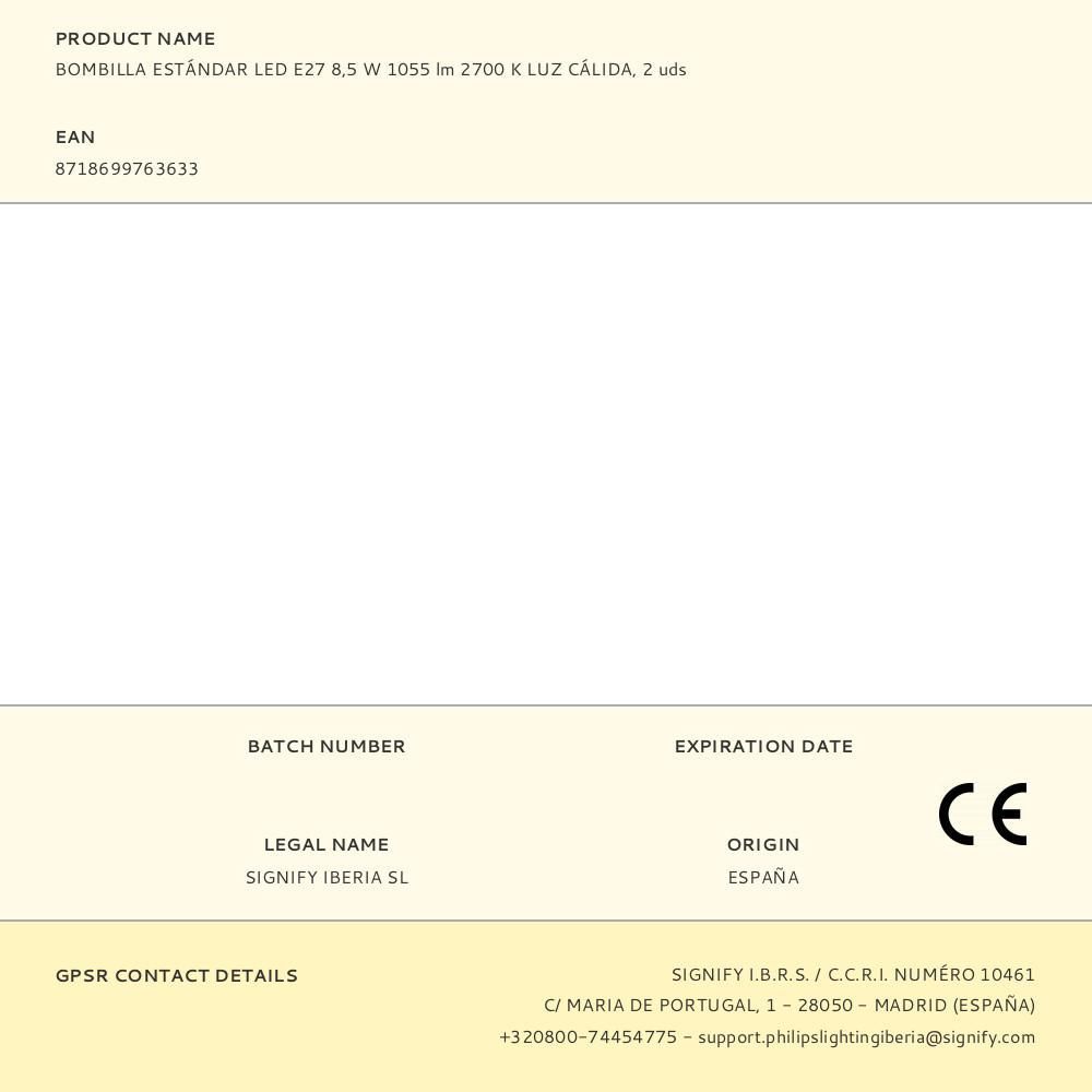 Bombilla Estándar Led E27 8,5 W (Equiv. 75 W) 1055 Lm 2700 K Luz Cálida, Cri 80, Clasificación Energética E, Vida Útil: 15.000 H, 220 - 240 V Ac 50/60 Hz. Flujo Luminoso 360°. Dimensiones: Ø6 X 10,4 Cm. 2 Ud