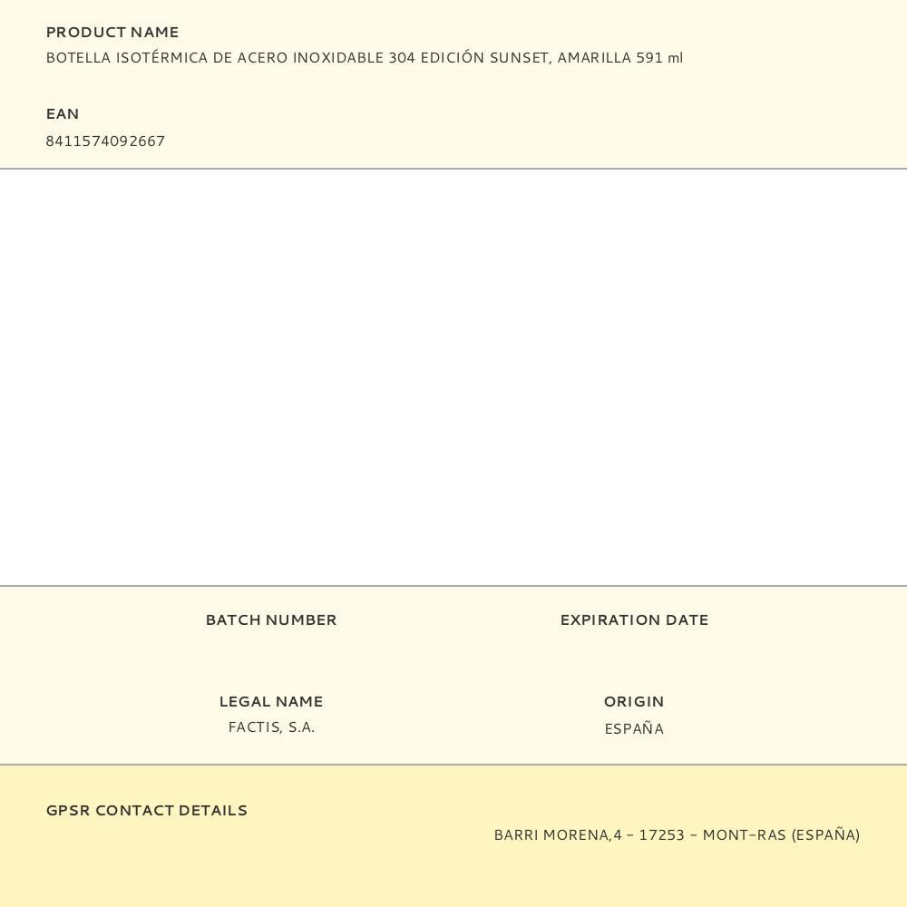 Botella Isotérmica De Acero Inoxidable 304 Sunset Amarilla 591 Ml. Aislamiento Al Vacío De Doble Capa Que Elimina La Condensación Y Permite Que La Parte Exterior Mantenga La Temperatura Ambiente. Mantiene La Temperatura Del Contenido Interior (Hasta 12 H Líquidos Calientes Y 24 H Líquidos Fríos). Tapón De Rosca Hermético. We Protect: El Uso De Botellas Reutilizables Contribuye A Reducir El Consumo De Botellas De Plástico De Un Solo Uso