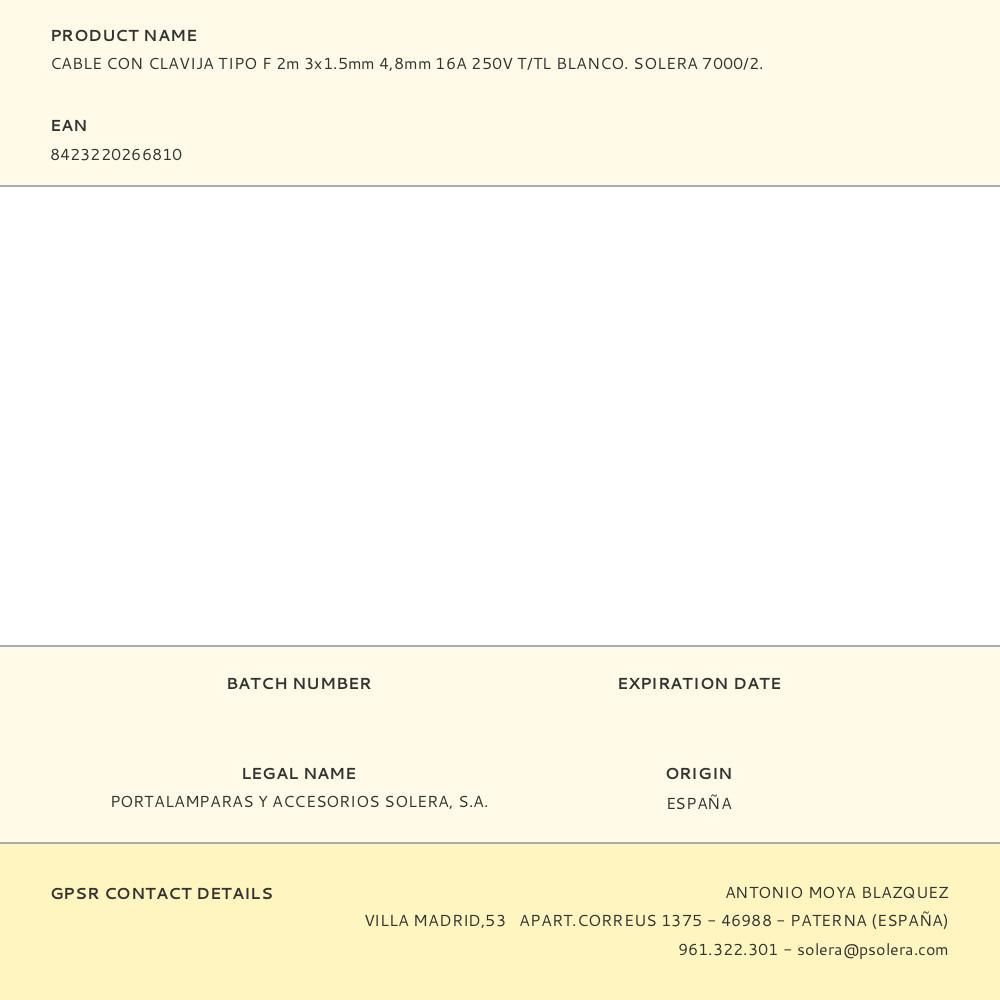 Cable Con Clavija Tipo F 2M 3X1,5Mm 4,8Mm 16A 250V T/Tl Blanco. Solera 7000/2. Para Aparatos De Clase I. Clavija Inyectada Con Salida De Cable A 90°. Con Doble Sistema De Tierra.