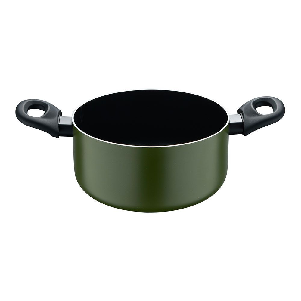 Cacerola De Aluminio Prensado, Con Tapa De Cristal, Para Inducción, Acabado Exterior Verde, Interior Con Revestimiento Antiadherente Negro, Exterior Resistente Al Calor En Pq-7764C. Asas Negras Resistente Al Calor Y Pomo Con Tacto Suave. Ø20 X 10 Cm