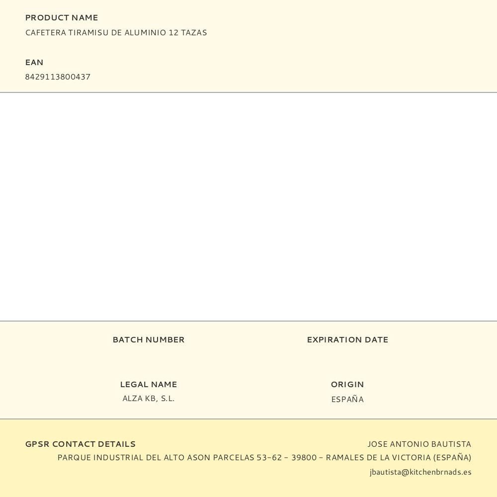 Cafetera Tiramisu 12 Tazas Aluminio. Acabado Interior Pulido. Junta De Silicona De Gran Durabilidad. Mangos Termoaislantes Fabricados En Nylon Muy Resistente. Apto Para Gas, Vitroceramica Y Electrica. No Apto Para Induccion. No Apta Para Lavavajillas