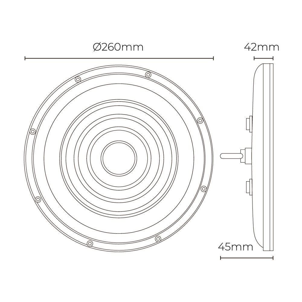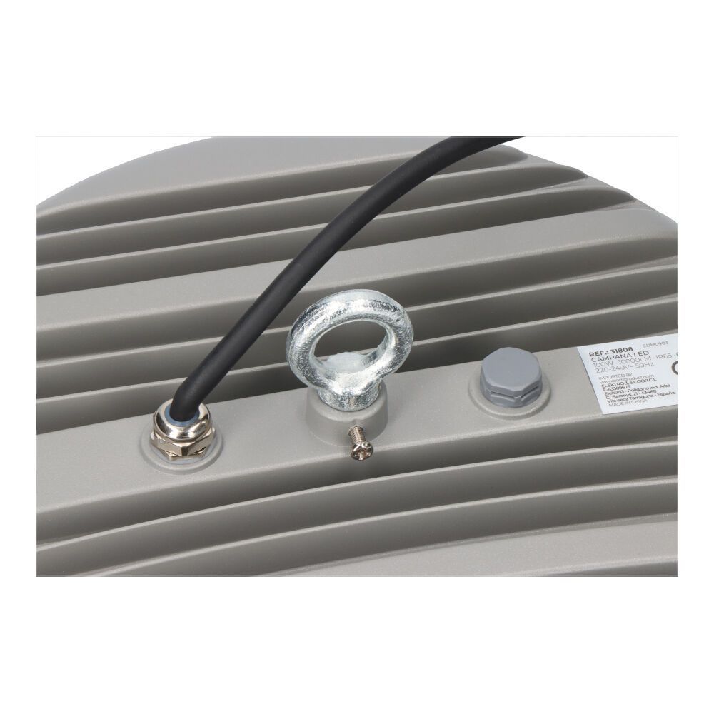Campana Led 100 W, 10.000 Lm, Luz Fría, 6400 K, Ip65, Df 0.9, Ra 80, 144 Leds, Tipo De Flujo Luminoso Wide Cone < 120°. Fabricada En Aluminio. No Incluye Cadena, Incluye Conector De Cables Estanco Ip68. 220 - 240 V ~ 50 Hz. Dimensiones Ø26 X 4,5 Cm