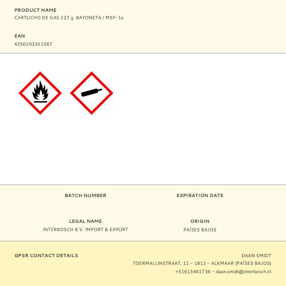 Cartucho Gas 227 G, Combustible Bajo Presión, Proteger De La Luz Directa Del Sol, No Exponer A Temperaturas Superiores A 50°C, Mantener En Un Area Bien Ventilada, Fuera Del Alcance De Los Niños. Cumple Con La Norma En417