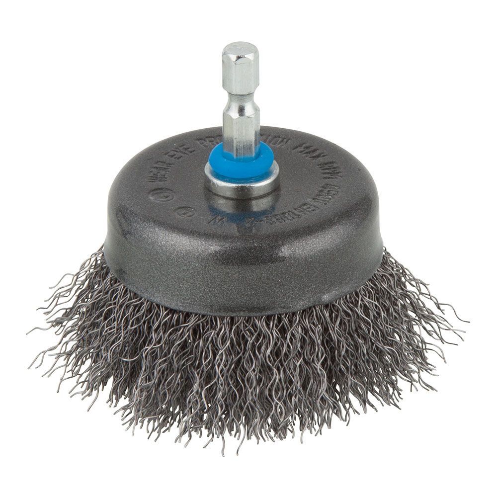 Cepillo De Copa De Alambre De Acero, Diámetro De Trabajo: Ø75 Mm, Longitud Del Alambre: 25 Mm, Versión De Vástago: Vástago Hexagonal De 6,35 Mm, 1/4 Pulg, Dimensiones: 75 X 75 X 65Mm