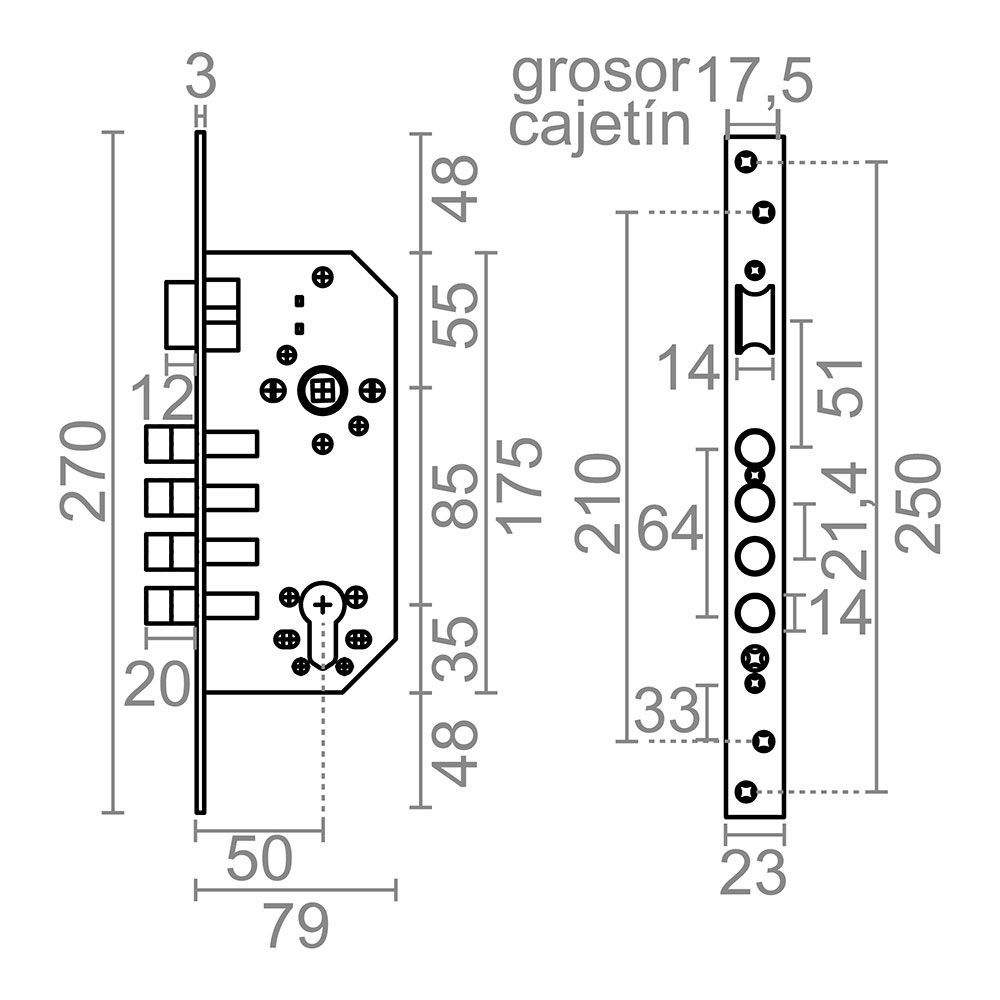 Cerradura Embutir Cre13 Para Cilindro De Perfil Europeo Con Leva Larga (L15) Y Con 4 Bulones De Cierre, Para Instalar En Puertas De Carpintería De Madera, Con Canto Cuadrado, Resbalón Reversible Y Nueca Para Cuadradillo De 8 Mm, Esta Cerradura Tiene Una Distancia Entre Ejes De 85 Mm Y Viene Preparada Con Una Entrada De 50 Mm, No Incluye Cilindro, Incluye Cerradero Y Tornillería, Fabricada En Acero, Acabado En Latonado