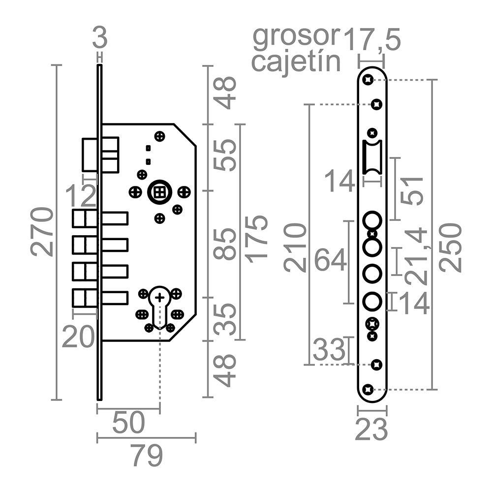 Cerradura Embutir Cre07 Para Cilindro De Perfil Europeo Con Leva Larga (L15) Y Con 4 Bulones De Cierre, Para Instalar En Puertas De Carpintería De Madera, Con Canto Redondo, Resbalón Reversible Y Nueca Para Cuadradillo De 8 Mm, Esta Cerradura Tiene Una Distancia Entre Ejes De 85 Mm Y Viene Preparada Con Una Entrada De 50 Mm, Con 4 Bulones De Cierre, No Incluye Cilindro Ni Escudo, Incluye Cerradero Y Tornillería, Fabricada En Acero, Acabado En Latonado