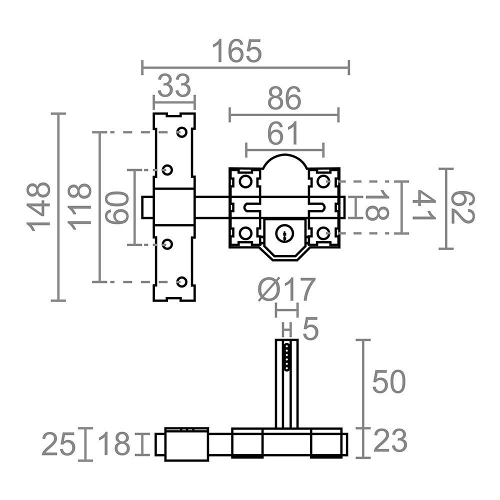 Cerrojo De Sobreponer Crr09 Con Placa De 86 Mm Y Cilindro De Boca Pera De 50 Mm, Para Reforzar La Seguridad Mediante La Instalación En Cualquier Tipo De Puerta, Además, Al Ser Reversible, No Guarda Mano, El Accionamiento Se Realiza De Manera Interna Y Externa Mediante Llave A Través Del Cilindro, Con 3 Llaves De Serreta, Fabricado En Acero, Acabado Pintado En Gris