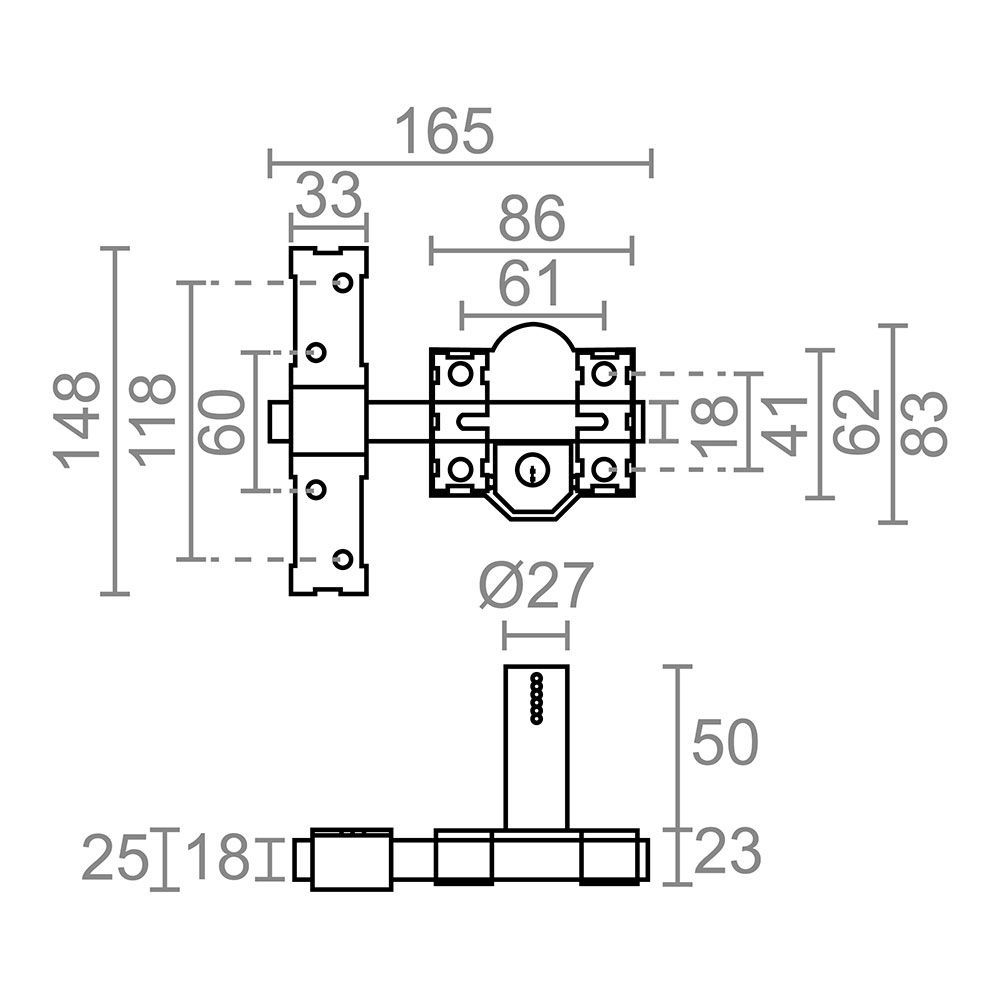 Cerrojo De Sobreponer Crr13 Con Placa De 86 Mm Y Cilindro Redondo De 50 Mm, Para Reforzar La Seguridad Mediante La Instalación En Cualquier Tipo De Puerta, Además, Al Ser Reversible No Guarda Mano, Tanto El Accionamiento Interior Como El Exterior Se Realiza Mediante Llave A Través Del Cilindro, Con 3 Llaves De Serreta, Fabricado En Acero, Acabado Pintado En Gris