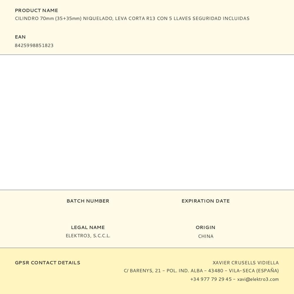 Cilindro 70Mm (35+35Mm) Niquelado, Leva Corta R13 Con 5 Llaves Seguridad Incluidas