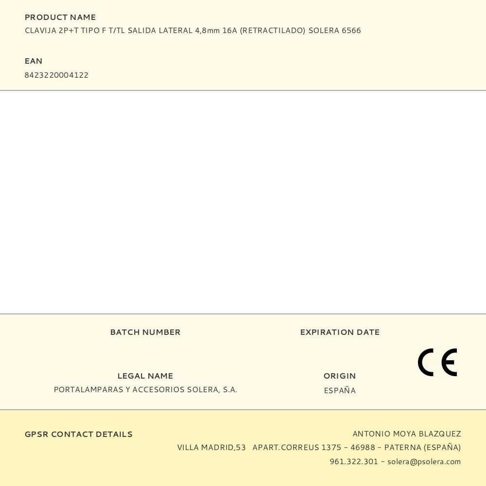 Clavija Schuko T/Tl Salida Lateral 4,8Mm 16A (Retractilado) Solera 6566