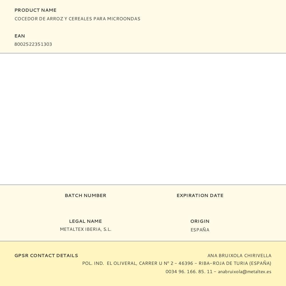 Cocedor Para Arroz Y Cereales Para Microondas Metaltex. Ideal Para Cocer Arroz, Quinoa, Polenta, Cuscús, Etc. Incluye Dosificador De Agua Y Una Espatula. Con Instrucciones De Uso. Capacidad 2,2L. 20.5X17X16Cm.