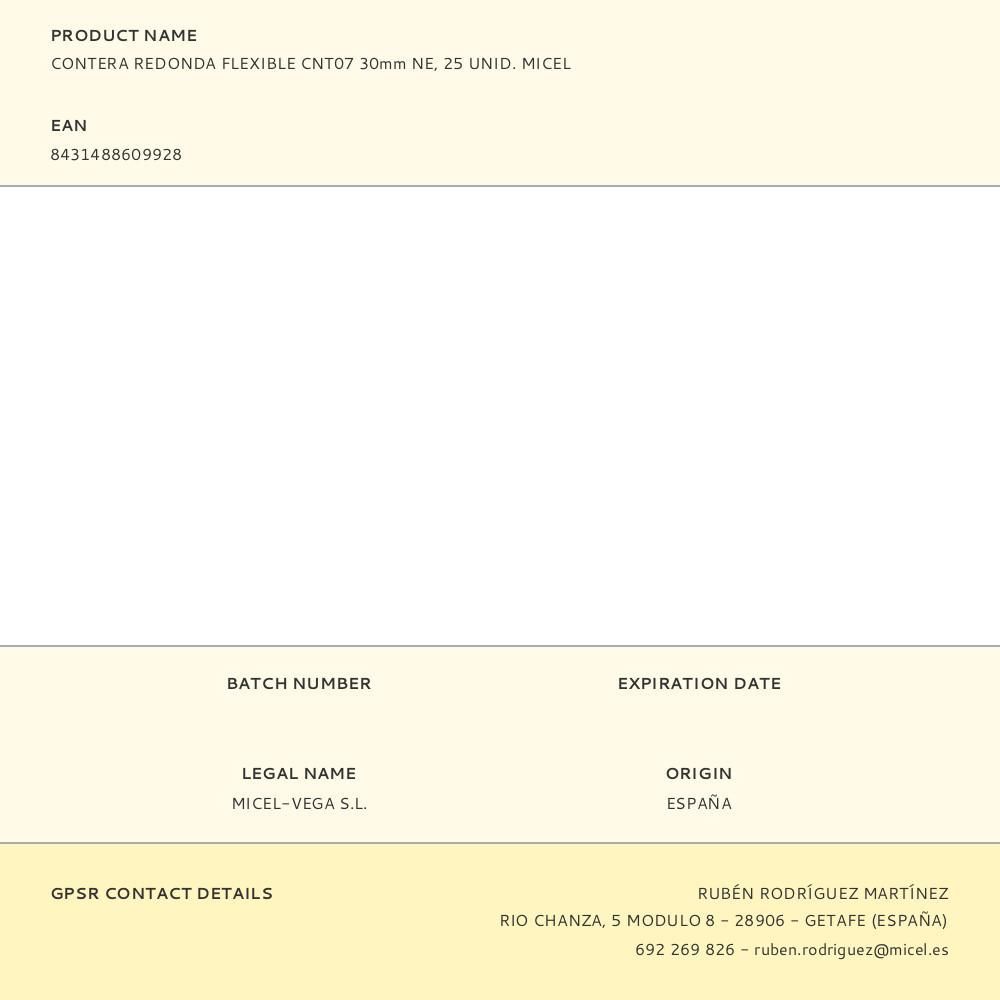 Caja Con 25 Conteras Redondas Flexibles Cnt07. Para Colocar En Patas De Mesas Y Sillas Y Proteger El Suelo Al Arrastrarlas Sobre Él. Para Una Medida De 30Mm De Diámetro. Medida De Alto De 36Mm. Fabricado En Caucho De Alta Resistencia, Se Adaptará Perfectamente Por Su Alta Flexibilidad. Acabado En Color Negro. Micel