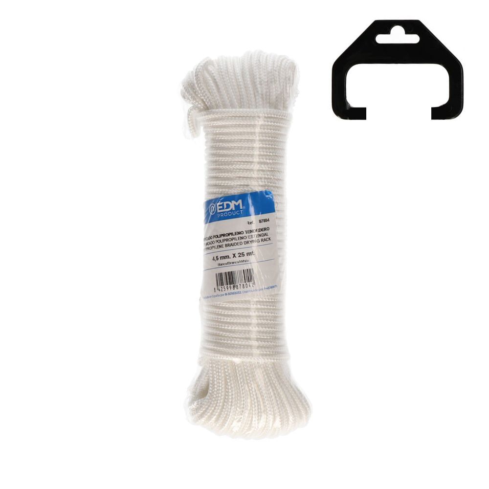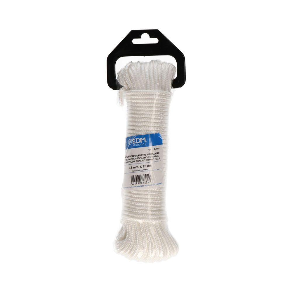 Madeja Trenzada Polipropileno Tendedero 25M. Composicion: Trenzado Polipropileno Alta Tenacidad Con Proteccion Solar. Alma Interior De Pp 100%. Caracteristicas: Suave, Flexible, Buena Resistencia, Flotabilidad. Absorcion 0%. Utilidades: Tendedederos Exteriores E Interiores, Camping, Nautica. 205Kg Ø: 4.5Mm