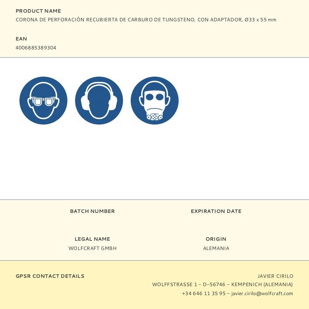 Corona De Perforación Recubierta De Carburo De Tungsteno, Ø33 X 55 Mm, Profundidad Máxima De Corte 55 Mm, Velocidad Máxima De Rotación 1.500 Rpm, Para Taladros En Paredes De Ladrillo Y Piedra, Vástago Hexagonal, Con Adaptador Y Broca Centradora (Ø8 Mm) Preinstalados, Certificación Tüv