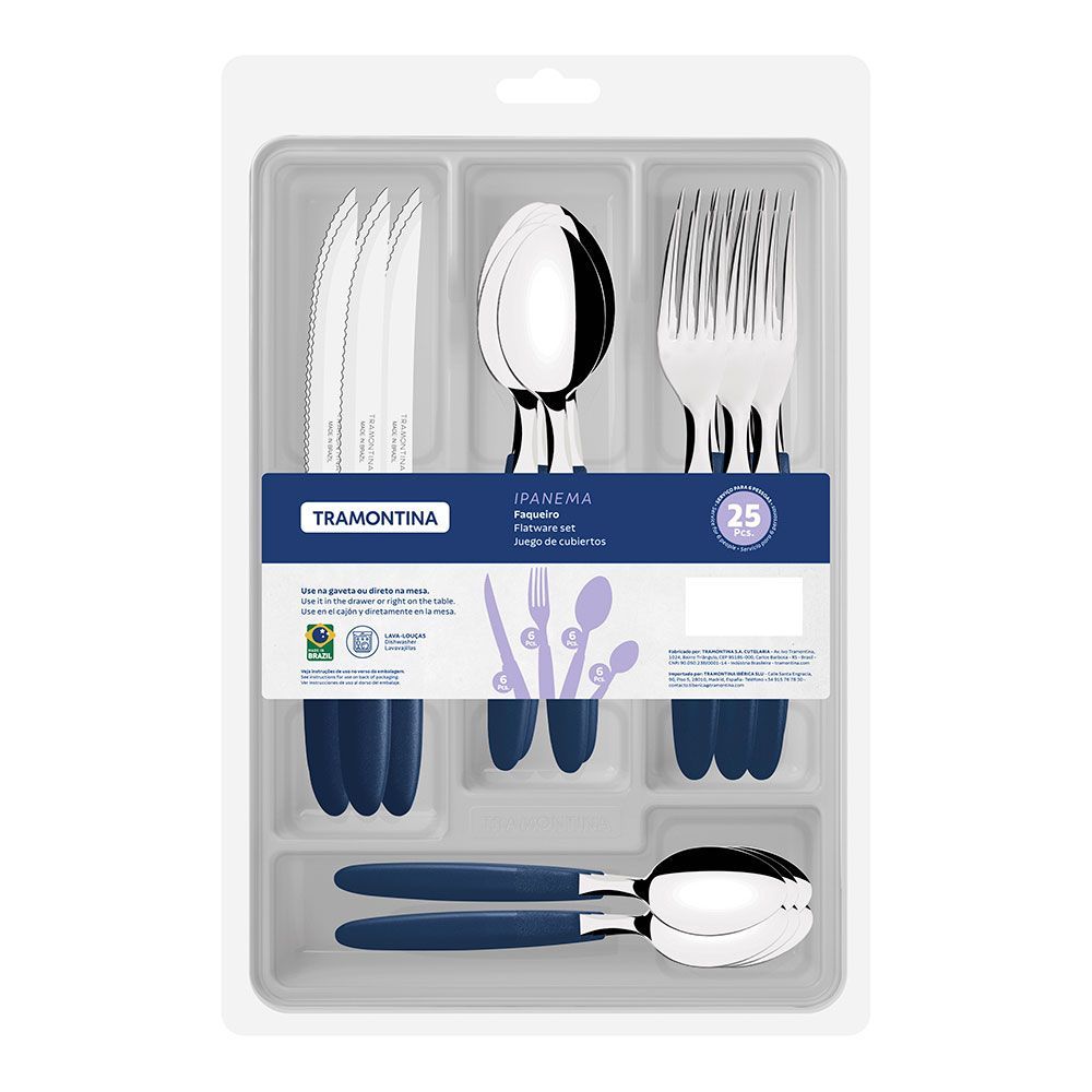 Cubertería De 25 Piezas Ipanema, En Acero Inoxidable, Mangos De Color Azul De Polipropileno. Incluye: Organizador De Plástico. 6 Cuchillos, 6 Tenedores, 6 Cucharas Y 6 Cucharas Pequeñas