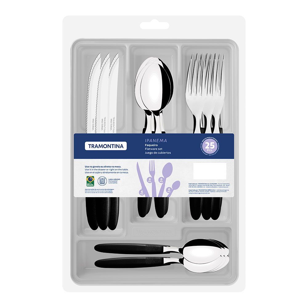 Cubertería De 25 Piezas Ipanema, En Acero Inoxidable, Mangos De Color Negro De Polipropileno. Incluye: Organizador De Plástico. 6 Cuchillos, 6 Tenedores, 6 Cucharas Y 6 Cucharas Pequeñas