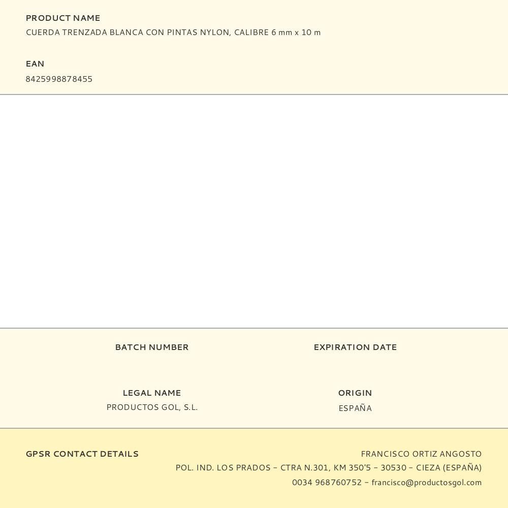 Cuerda Trenzada Blanca Con Pintas Nylon, Calibre 6 Mm X 10 M