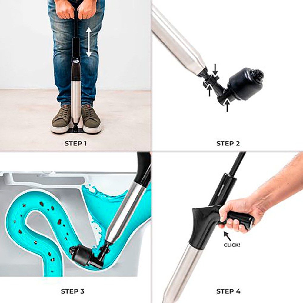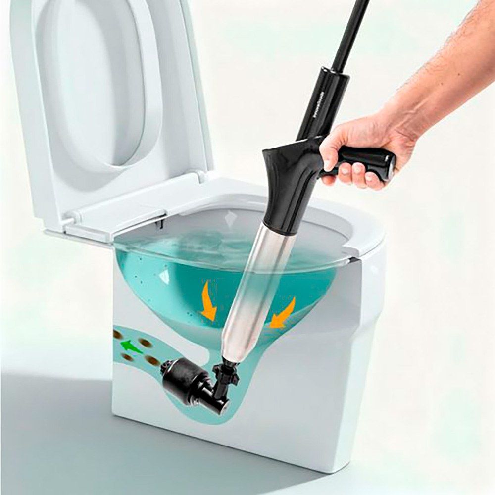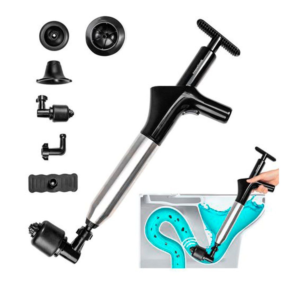 Desatascador De Aire Comprimido, Presión De 0-8 Bares, Contiene 7 Accesorios: Pieza Acodada Para Zonas De Suelo Poco Accesibles, Cabezal Para Pequeños Desagües, Pieza Acodada Para Ciertos Tipos De Inodoros, Adaptador Para Fregaderos O Desagües Medianos, Adaptador Para Inodoros O Desagües Grandes, Soporte Para El Llenado De Presión Y Colgador De Pared + Adhesivo. Diámetro Máximo De 20,5 Cm, Dimensiones 55,5 X 5 X 20 Cm