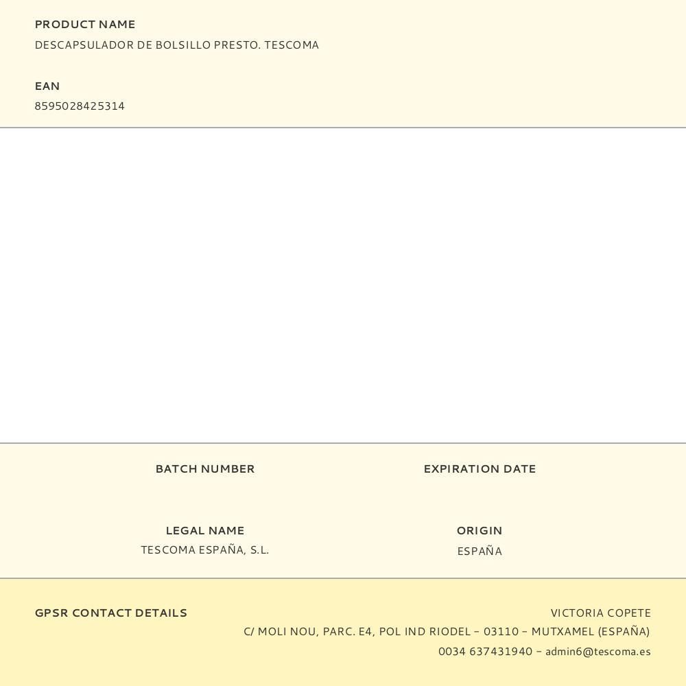Descapsulador De Bolsillo Presto. Excelente Para Abrir Fácilmente Botellas Con Tapón Metálico. . Fabricado En Metal De Alta Calidad Con Tratamiento Duradero En La Superficie. Garantía De 3 Años