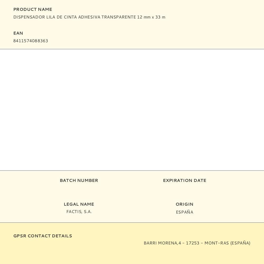 Blíster Cinta Adhesiva 12Mm X 33M Con Dispensador Recargable Color Lila. Cinta Transparente De Tono Ligeramente Amarillo, Acabado Brillante. Con Hoja De Corte Metálica. Milan