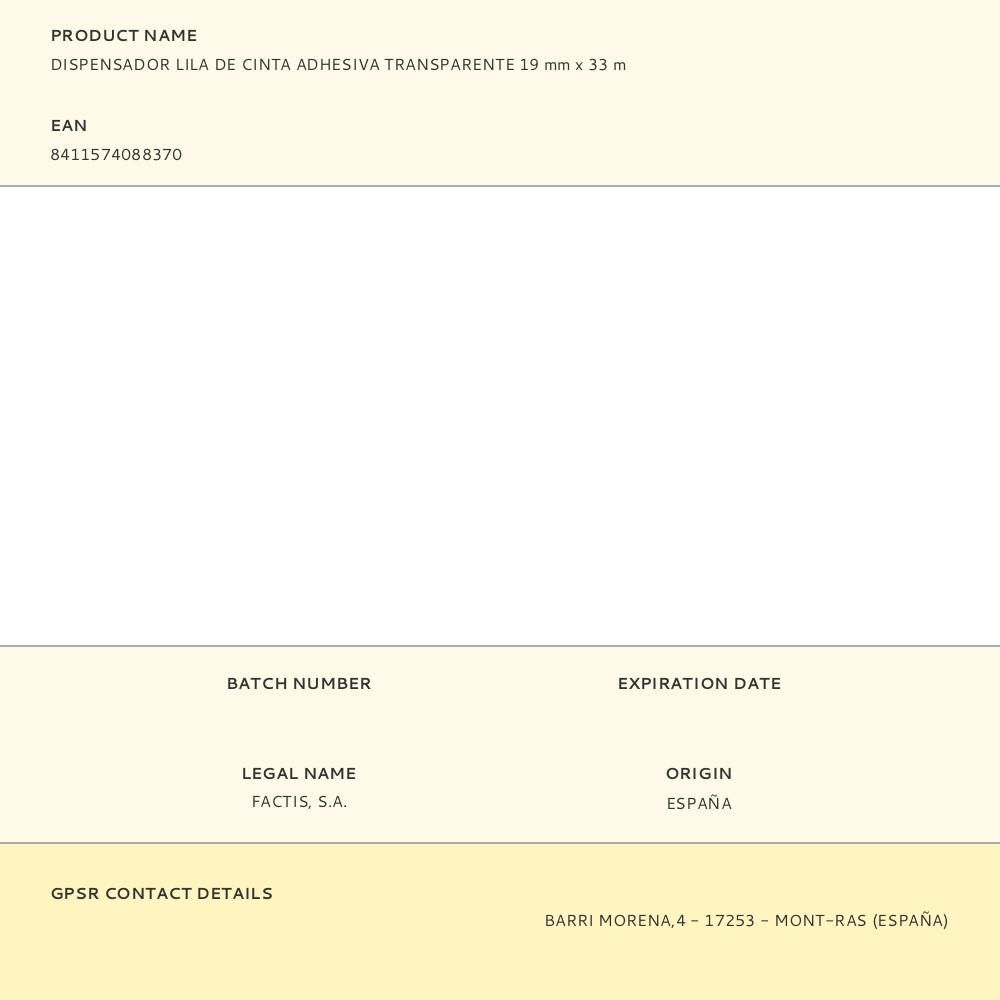 Blíster Cinta Adhesiva 19Mm X 33M Con Dispensador Recargable Color Lila. Cinta Transparente De Tono Ligeramente Amarillo, Acabado Brillante. Con Hoja De Corte Metálica. Milan