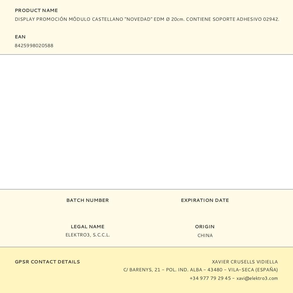 Display Promoción Módulo Castellano "Novedad" Edm Ø 20Cm. Contiene Soporte Adhesivo 02942.