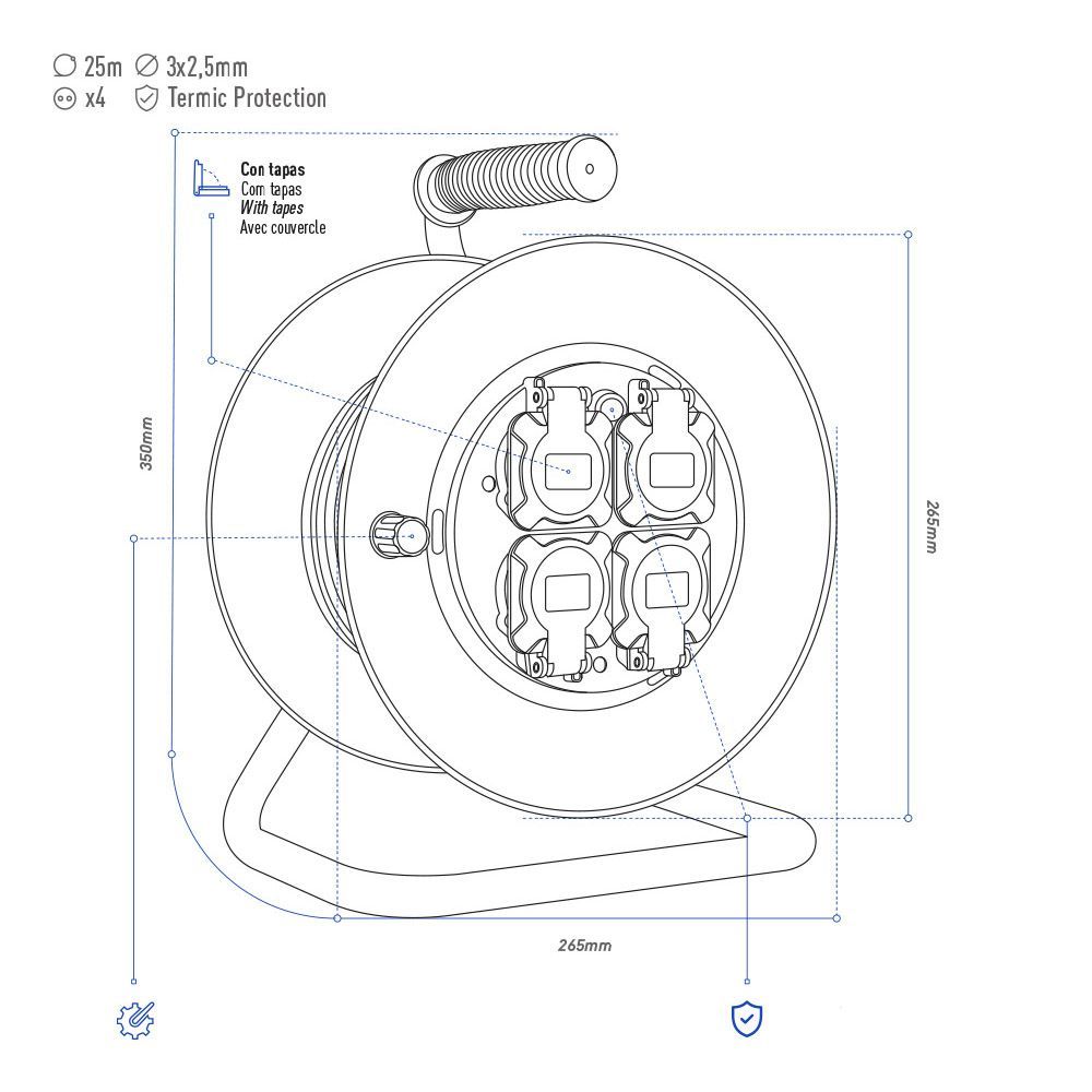 Enrollacables 25 M 3 G 2,50 Mm² 4 Tomas Bipolares Con T/Tl Con Tapas Profesional Con Protector Termico 3000W 230V