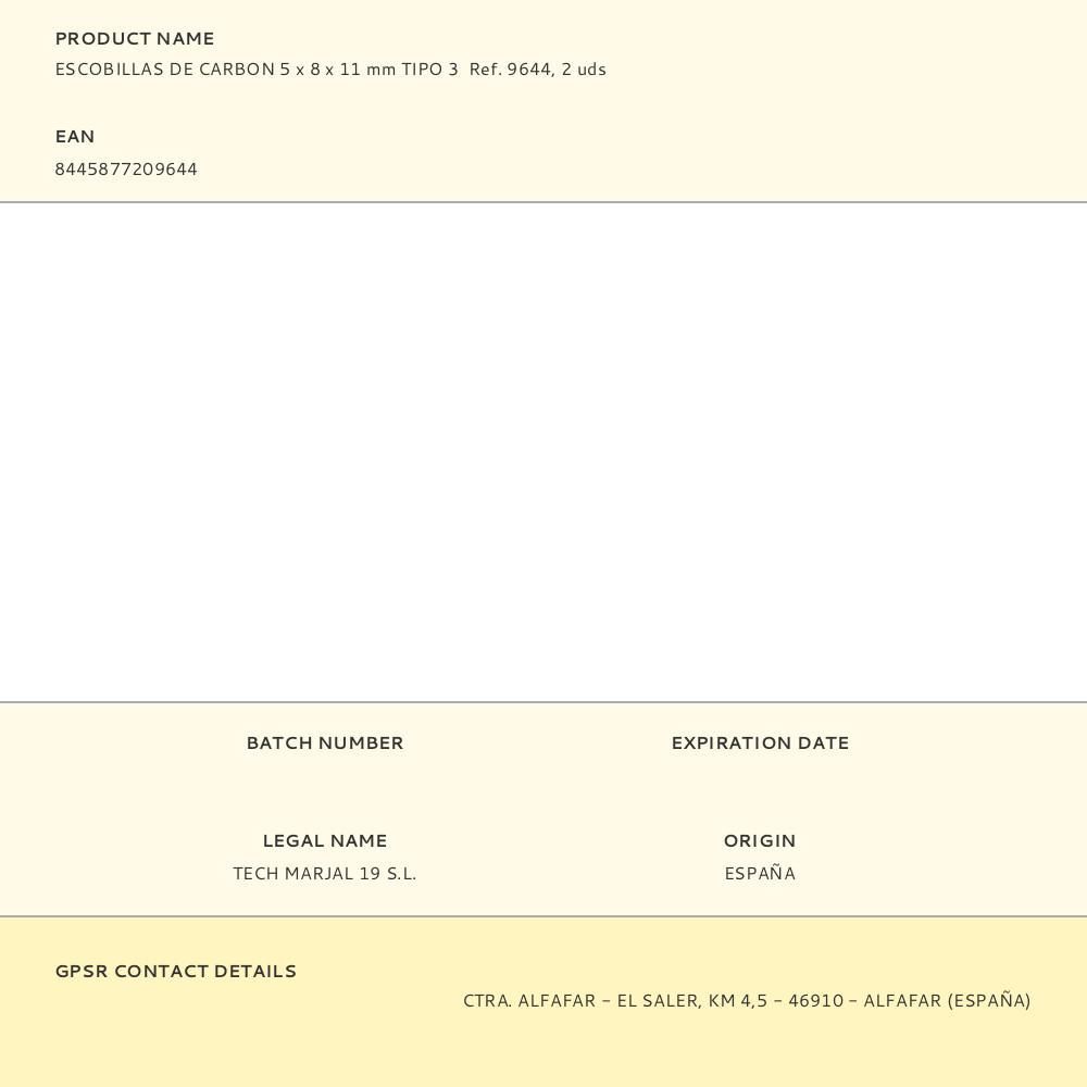Escobillas De Carbon 5 X 8 X 11 Mm. Ref. 9644. El Producto Se Sirve Por Parejas, Siendo Compatibles Con Las Principales Marcas De Máquinas Electroportátiles. Busca Tu Modelo De Escobilla En: Https://Grafitosmarjal.Com/