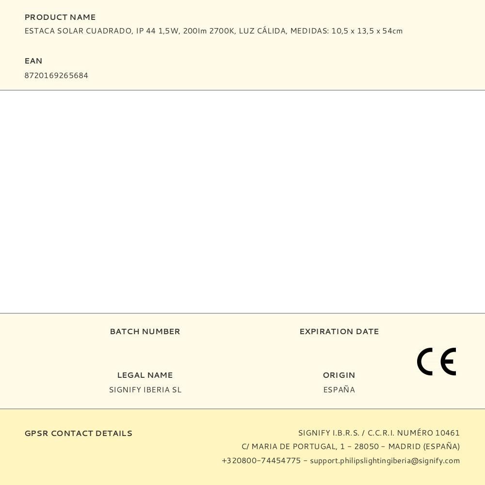 Pedestal Solar Vynce Cuadrado, Ip 44 1,5W, 200Im 2700K, Luz Cálida, Medidas: 10,5X13,5X54Cm, Tipo De Flujo 200°, Horas De Funcionamiento 15.000H Aprox. Philips
