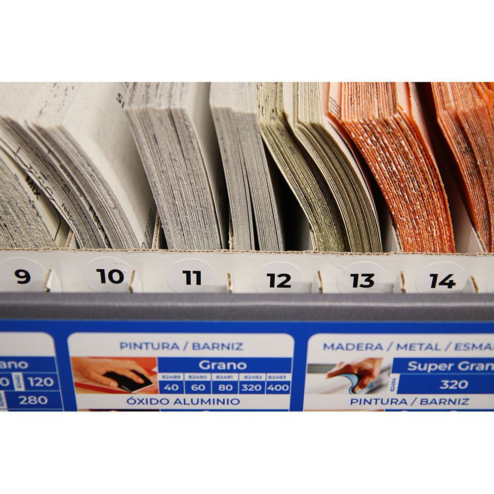 Expositor De Carton Para Papel De Lija 49X22X37Cm Edm Con 15 Ranuras Para Exponer Diferentes Lijas, Incluye Tiras Portaetiquetas Y Vinilos Informativos.