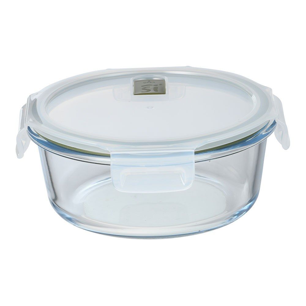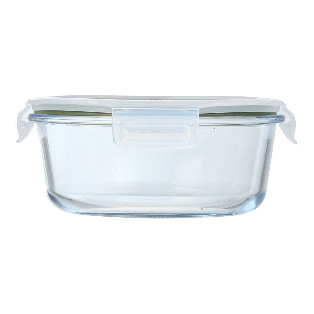 Fiambrera Hermética De Vidrio De Borosilicato Redonda, Serie Experto, Tapa De Pp Transparente Y Silicona De Color Verde Oliva, Con 4 Cierres Y Válvula De Descompresión, Apilable, Apta Para Congelador, Frigorífico Y Lavavajillas, Apta Sin La Tapa Para Microondas Y Horno, 950 Ml, Ø18,4 X 7,6 Cm