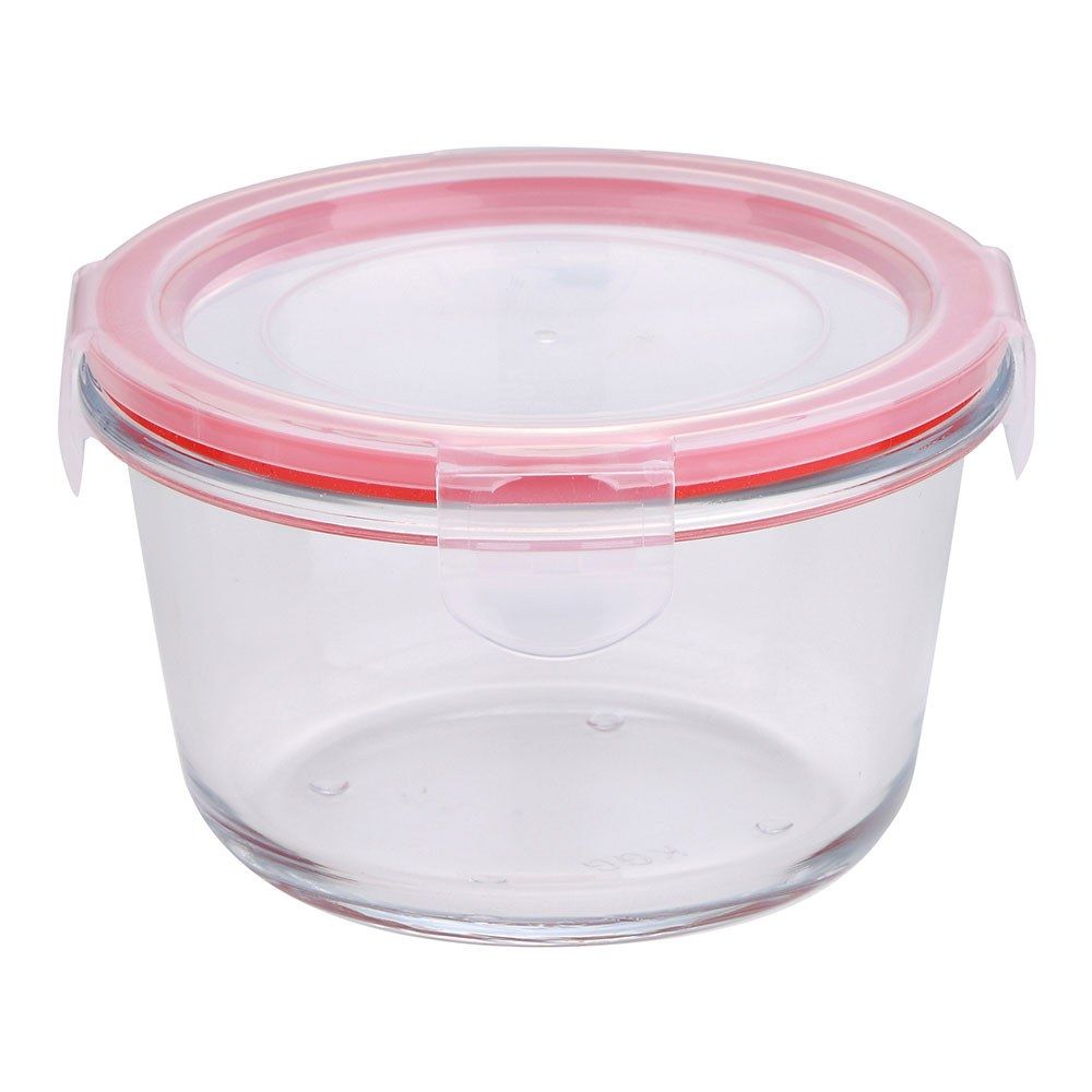Fiambrera Hermética De Vidrio De Borosilicato Redonda, Serie Toledo, Tapa De Pp Transparente Y Silicona De Color Rojo, Con 4 Cierres. Apilable, Apta Para Congelador, Frigorífico Y Lavavajillas, Apta Sin La Tapa Para Microondas Y Horno, 500 Ml, Ø12,5 X 7 Cm