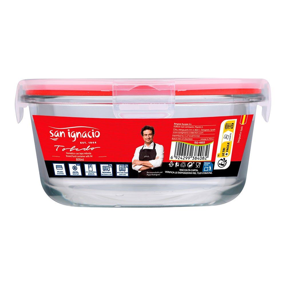 Fiambrera Hermética De Vidrio De Borosilicato Redonda, Serie Toledo, Tapa De Pp Transparente Y Silicona De Color Rojo, Con 4 Cierres. Apilable, Apta Para Congelador, Frigorífico Y Lavavajillas, Apta Sin La Tapa Para Microondas Y Horno, 800 Ml, Ø16 X 8 Cm