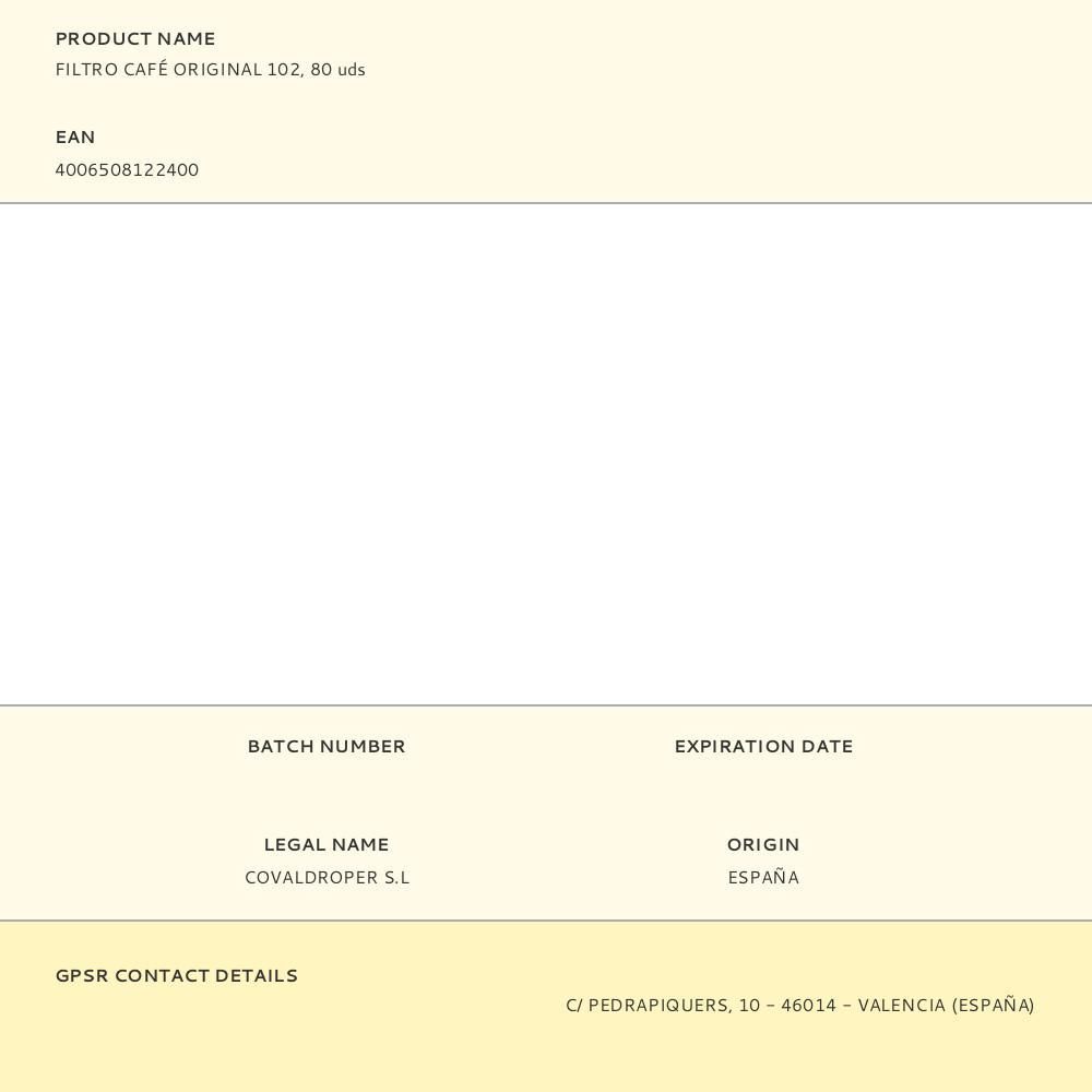 Filtro De Papel Para Cafetera De Goteo, Modelo: Original 102, 80 Uds